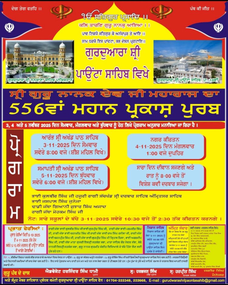 सिख समाज के पहले गुरु नानक देव जी के 556वें प्रकटोत्सव के लिए पाँवटा साहिब में गुरुद्वारा प्रबंधक कमेटी द्वारा तीन दिवसीय प्रकाश उत्सव मनाया जा रहा है जो आज यानी सोमवार 03 नवम्बर से अखंड पाठ के साथ शुरु हो गया है। गुरुद्वारा श्री पांवटा साहिब के उप प्रधान जत्थेदार जोगा सिंह, प्रबंधक सरदार जागीर सिंह, महासचिव हरप्रीत सिंह रतन, मीत प्रधान हरभजन सिंह और गुरमीत सिंह आदि ने जानकारी देते हुए बताया कि गुरु नानक देव जी के 556वें प्रकटोत्सव के उपलक्ष पर 03 नवम्बर से गुरुद्वारा साहिब में कार्यक्रम आरंभ हो गये है। श्रद्वालुओं द्वारा 3 अखण्ड पाठ शुरु किये गये हैं जो भोग के साथ 05 नवम्बर को सुबह 6 बजे संपन्न होंगे। उन्होने बताया कि इस आयोजन के लिए बड़ी संख्या मे संगत पाँवटा साहिब पंहुच रही है जो गुरुद्वारा श्री पांवटा साहिब समैत गुरुद्वारा श्री कपाल मोचन यमुनानगर मे माथा टेककर सुख समृद्वि की कामना करेगी। उनके ठहराव व लंगर की गुरुद्वारे मे विशेष व्यवस्था की गई है।
