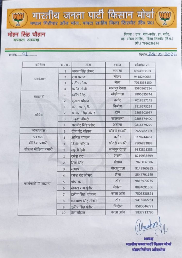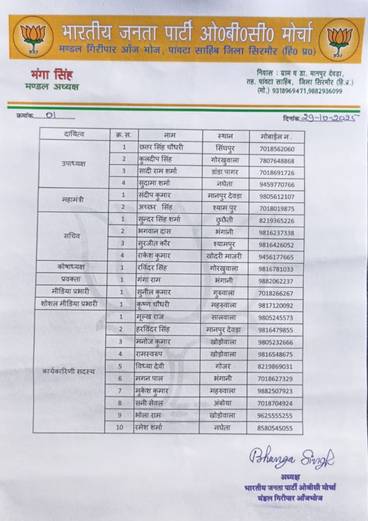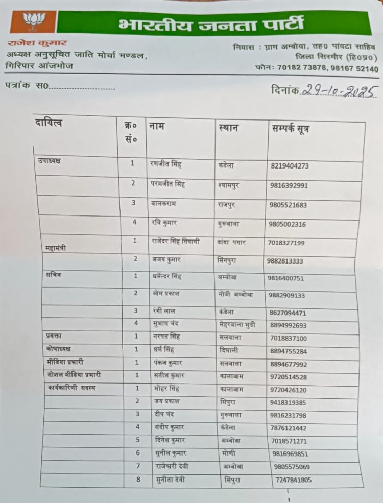 Paonta Sahib: भाजपा मंडल अध्यक्ष गिरिपार आंजभोज रमेश तोमर ने घोषित की किसान, ओबीसी और एससी मोर्चा की कार्यकारिणी, पढ़ें पूरी सूची...