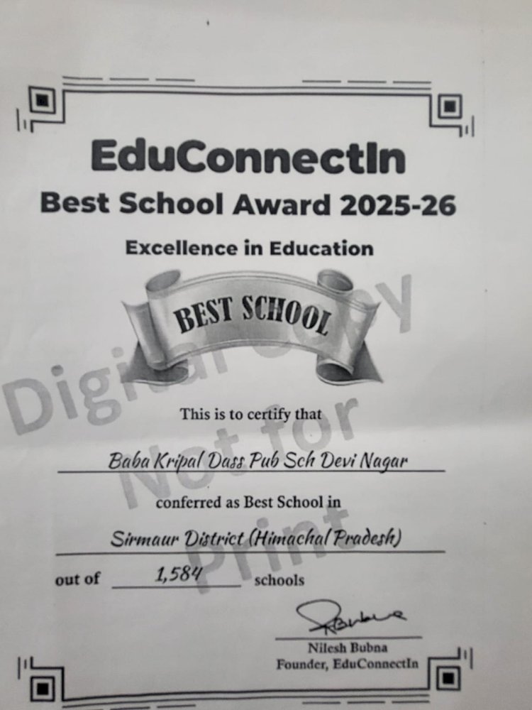 सत्र 2025-26 में Educonnectin द्वारा किए गए सर्वेक्षण के अनुसार जिला सिरमौर में H. P. Board से मान्यता प्राप्त स्कूलों में B.K.D. सीनियर सेकेंडरी पब्लिक स्कूल को बेस्ट स्कूल का रैंक मिला है। इस अचीवमेंट पर स्कूल में खुशी का माहौल है।