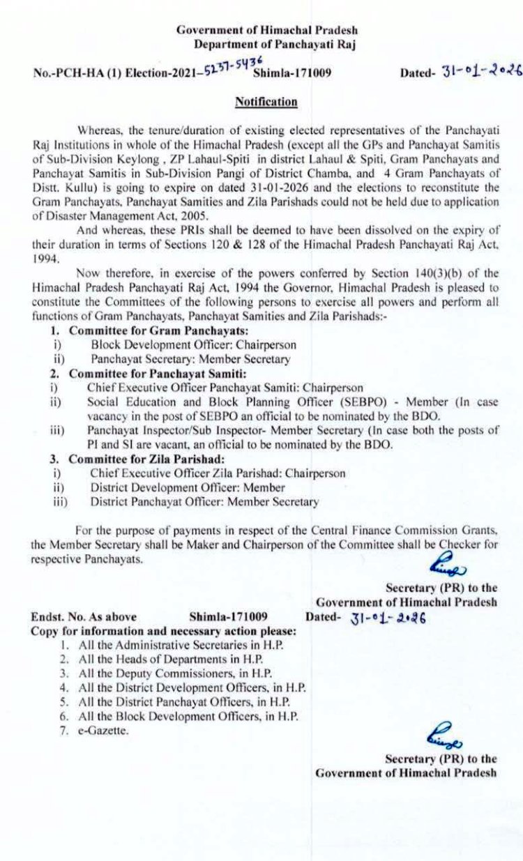 सरकार ने दूर कर दिया है। सरकार ने स्पष्ट किया है कि 1 फरवरी से पंचायतों में कामकाज नहीं रुकेगा, बल्कि इसके लिए एक नई वैकल्पिक व्यवस्था लागू कर दी गई है, जिसकी अधिसूचना पंचायती राज विभाग की तरफ से जारी कर दी गई है। जारी अधिसूचना के अनुसार, 31 जनवरी, 2026 को कार्यकाल पूरा होते ही वर्तमान में चुनी हुई सभी पंचायती राज संस्थाएं (ग्राम पंचायत, पंचायत समिति और जिला परिषद) भंग मानी जाएंगी। हिमाचल प्रदेश पंचायती राज अधिनियम, 1994 की धारा 120 और 128 के तहत यह कार्यवाही की गई है। बता दें कि आपदा प्रबंधन अधिनियम-2005 लागू होने के कारण समय पर चुनाव कराना संभव नहीं हो पाया है, इसलिए सरकार ने वैकल्पिक व्यवस्था की है।